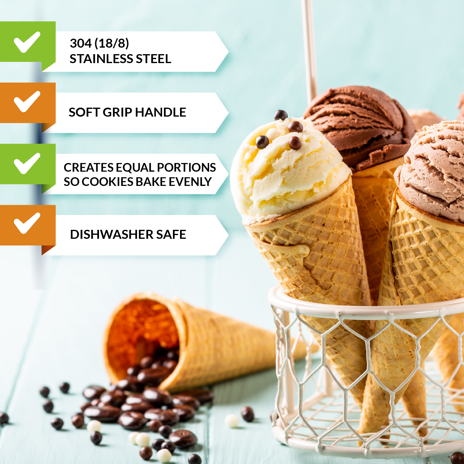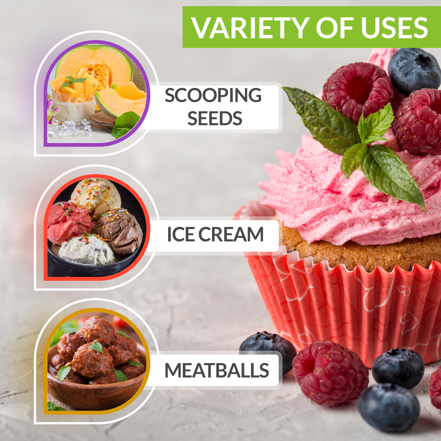 Versatile Batter Scoop - This kitchen tool does more than scoop cookie dough. You can use it as cupcake scoop, protein balls scoop, meatballs scoop, melon baller scoop, ice cream scoop, sorbet scoop, muffin scoop, cake pop scoop and so much more!