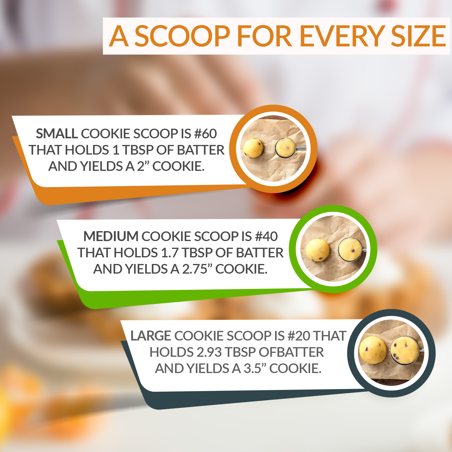 Large size #20 Disher holds 2.93 Tbsp of batter and yields a 3.5” Cookie.