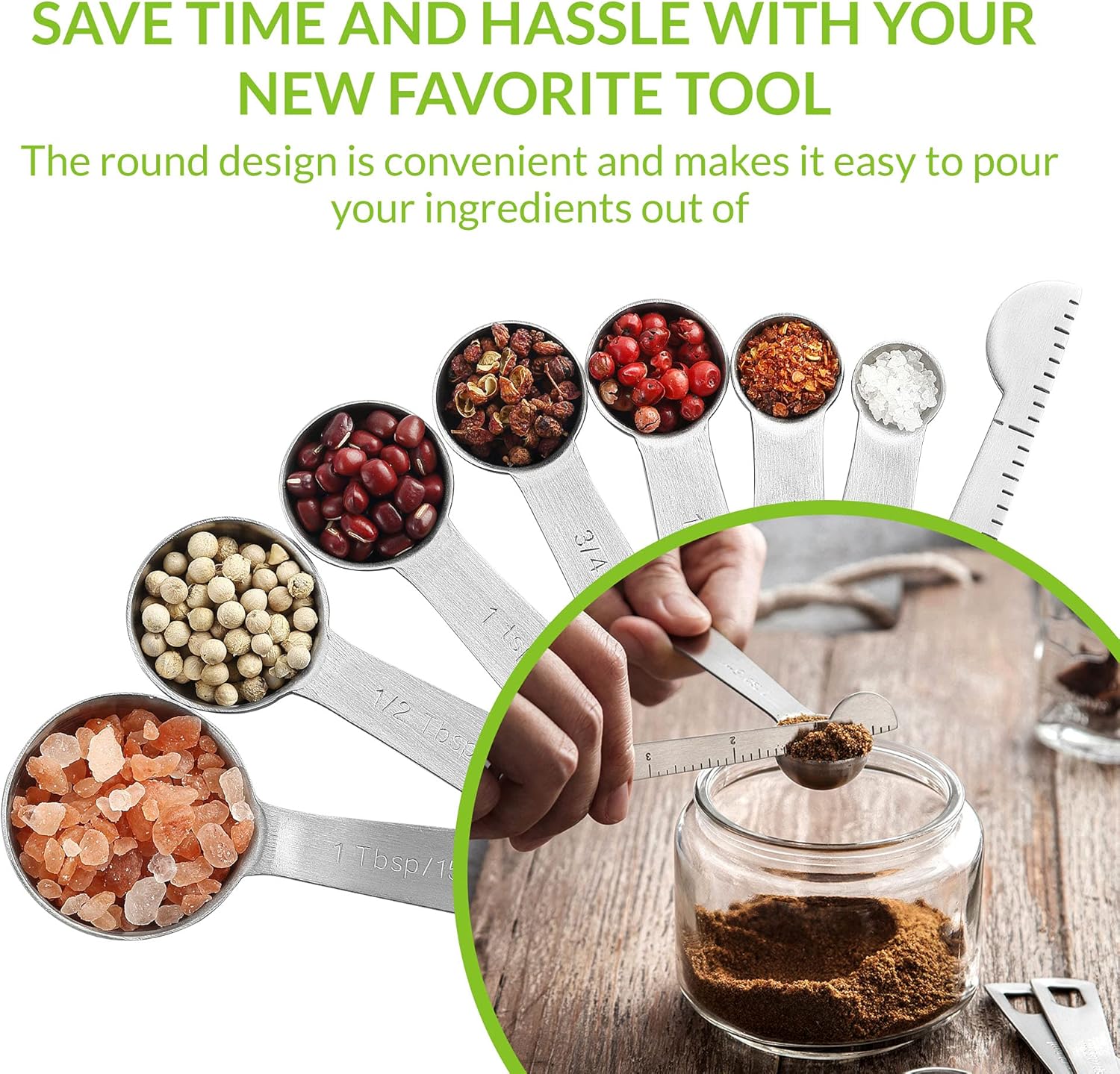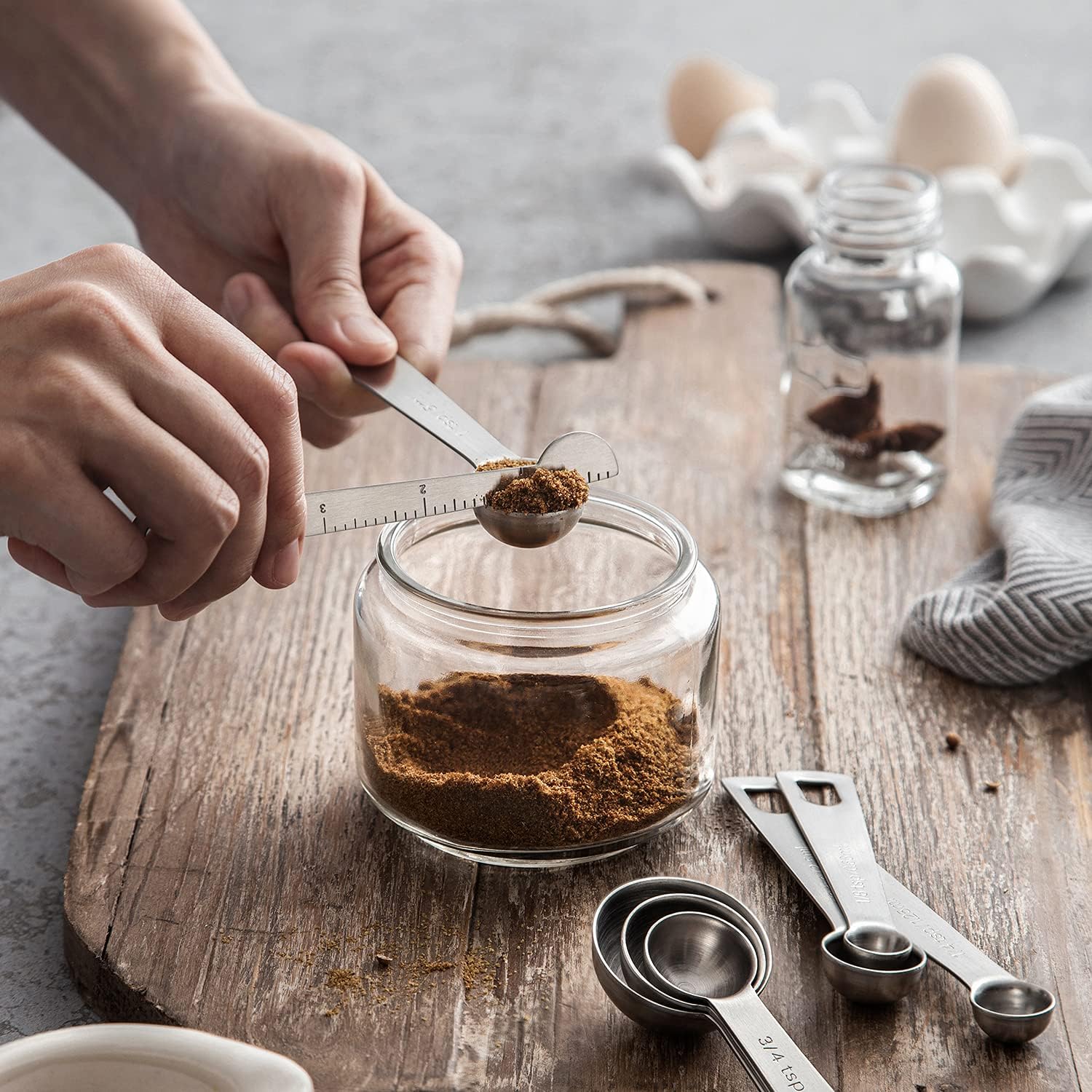 Time-Saving and Compact - With their easy-to-fill round design, these stainless measuring spoons for measuring dry and liquid ingredients fit easily inside narrow spice jars. This kitchen measuring set is also held together by a detachable ring, so you can use and organize them without hassles.