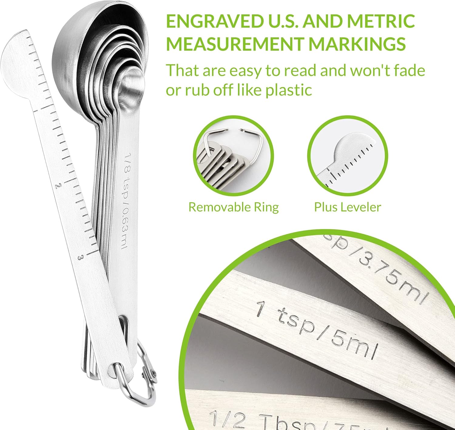 Built to Last - These must-have kitchen tools are rust-resistant and made of heavy duty premium stainless steel. Each measuring spoons’ measurements are engraved, so they stay clearly marked and will not fade or rub off, no matter how long you use them.