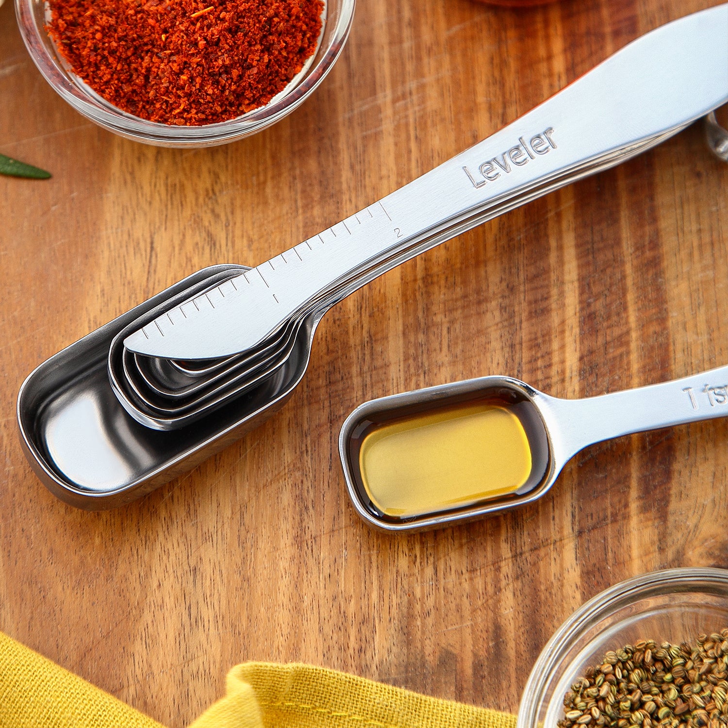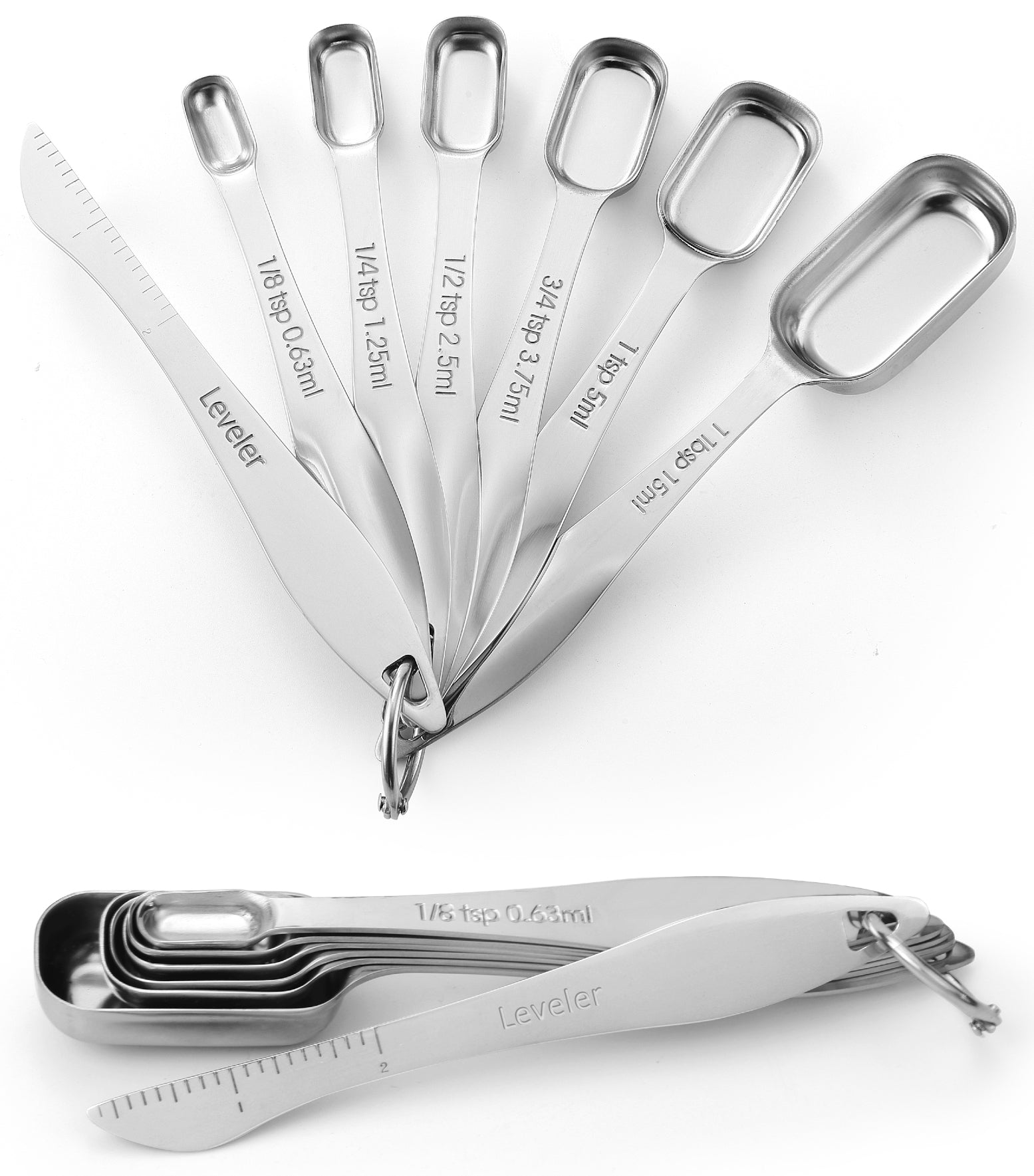 COMPLETE, ACCURATE SET TO HELP YOU GET HEALTHY, MEASURE MEDICINE AND MORE - Precise quantity of ingredients is what you need to get great results with cooking and baking. You can also make tasty recipes to help you lose weight with these amazing spoons. 6 Convenient Sizes: 1/8 tsp, 1/4 tsp, 1/2 tsp, 3/4 tsp, 1 tsp, 1 Tbsp Plus Leveler. You'll be thrilled with its wide, long handle that is comfortable to hold and its ergonomic design that is easy to fill and level.